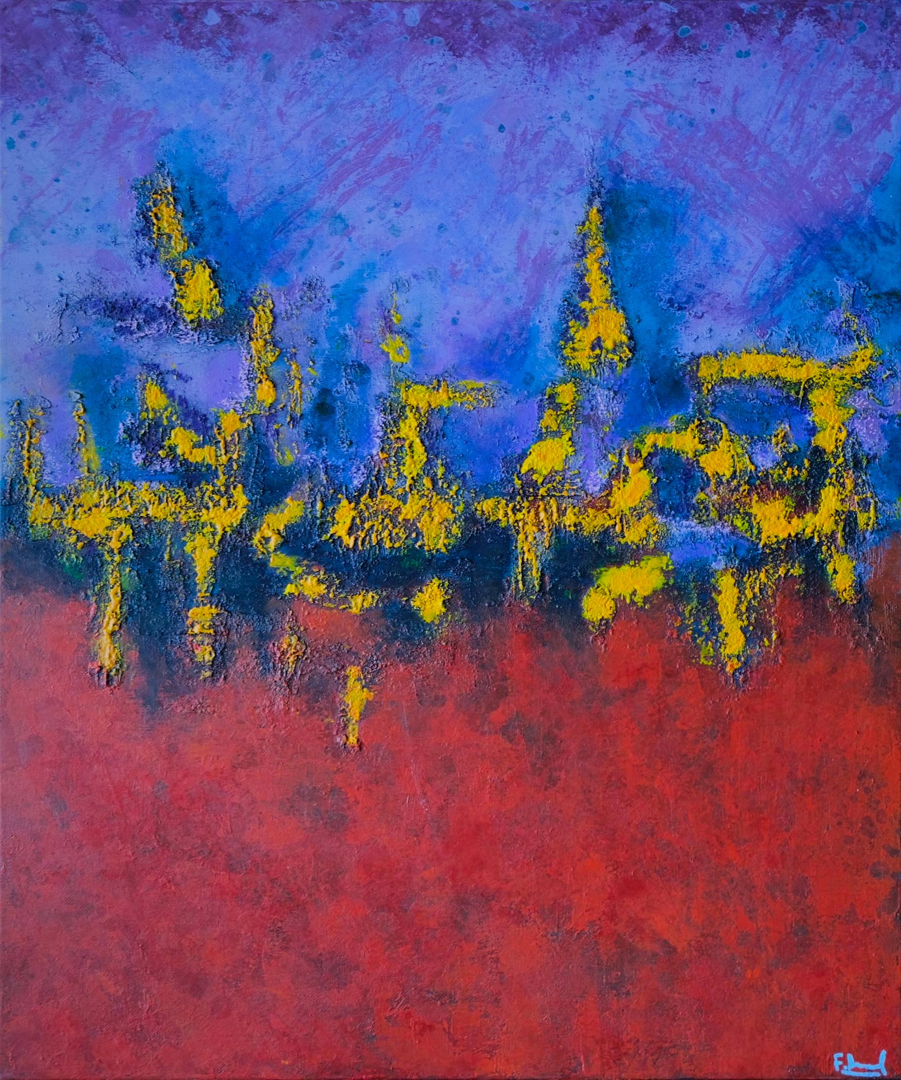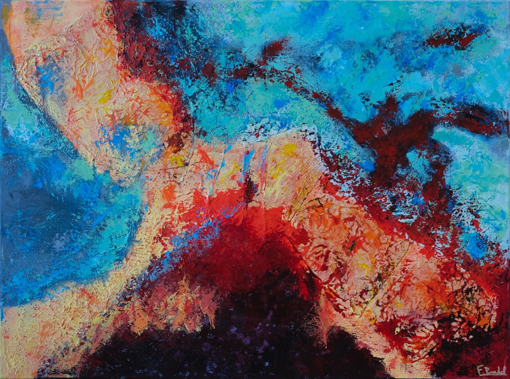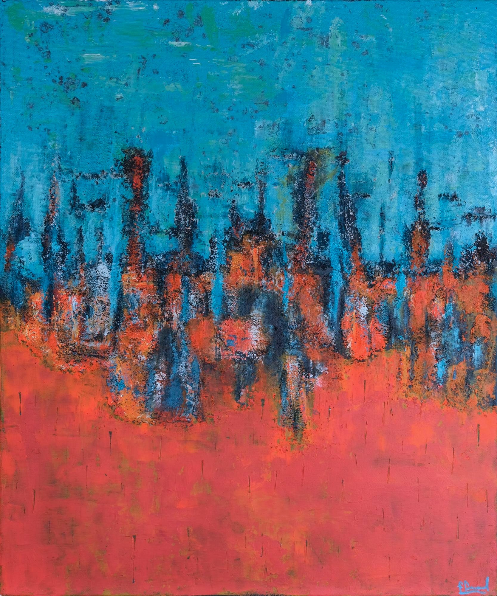 Ce qui m’attire dans la peinture, ce sont les textures et les couleurs. J’ai un faible pour les couleurs vives, qu’elles soient chaudes ou davantage tournées vers le bleu. Lorsque je commence un tableau, j’ai une idée des couleurs que je veux travailler mais je ne sais jamais où cela va me mener, je lâche prise et me laisse guider par la couleur. J’aime le crissement du sable mélangé à la peinture et étalé au couteau sur la toile. Peindre est une expérience physique et sensorielle où le temps est suspendu.